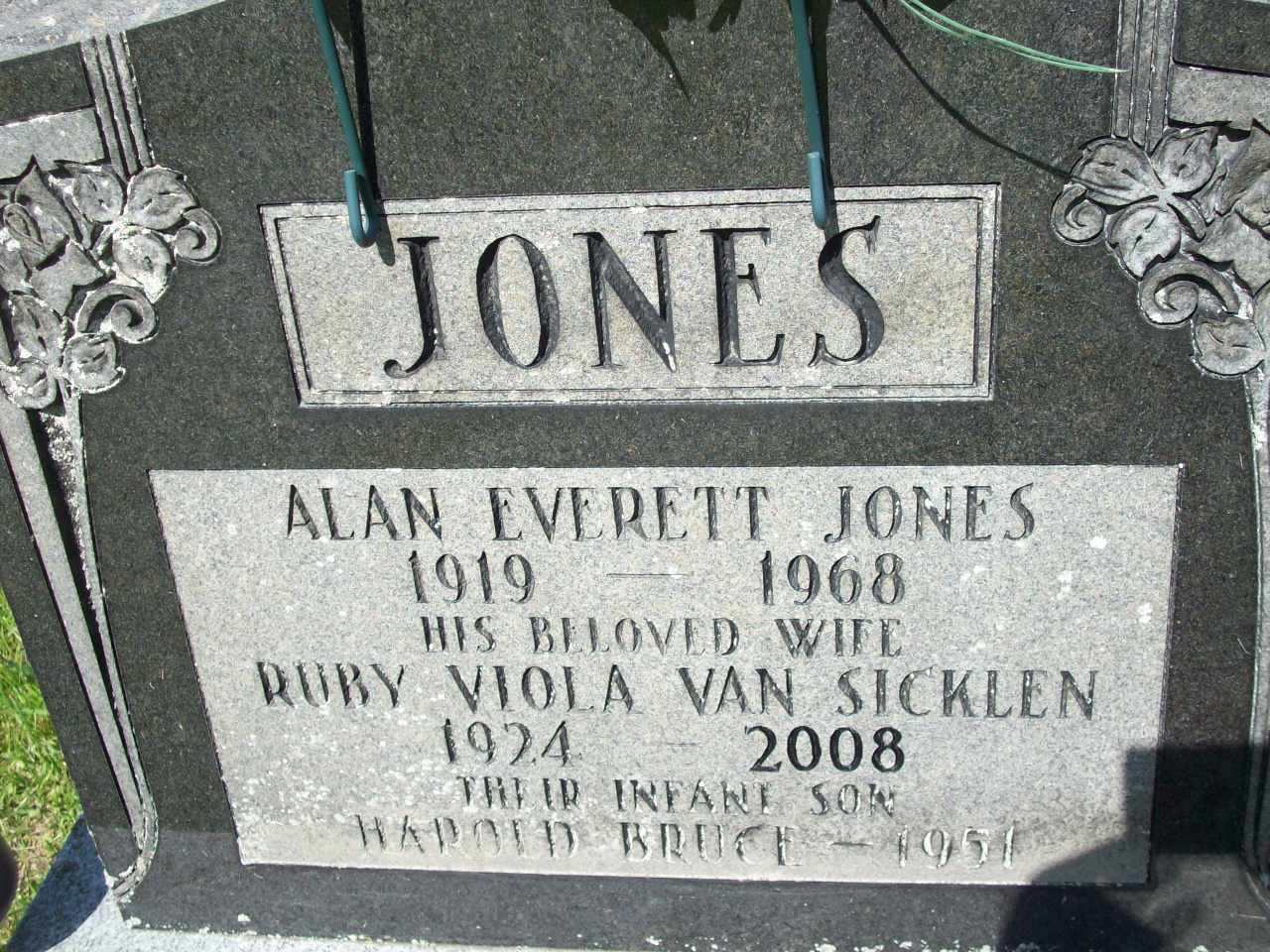 Harold Bruce Jones died on 18 January 1951 at Ontario; Date 1951 per Memorial. Date Jan 18 1951 per family tree of DonnaCowie39 on ancestry.ca, Sep 25 2020.1,2 He was born on 18 January 1951 at Ontario; Date 1951 per Memorial. Date Jan 18 1951 per family tree of DonnaCowie39 on ancestry.ca, Sep 25 2020.1,2 He was buried on 20 January 1951 at Castleton Cemetery, Castleton, Northumberland Co., Ontario; Memorial: (See Exhibit) JONES; Alan Everett Jones; 1919 - 1968; His Beloved Wife; Ruby Viola Van Sicklen; 1924 - 2008; Their Infant Son; Harold Bruce - 1951 (Castleton Cemetery, Castleton, July 13 2009, by Dan.)1