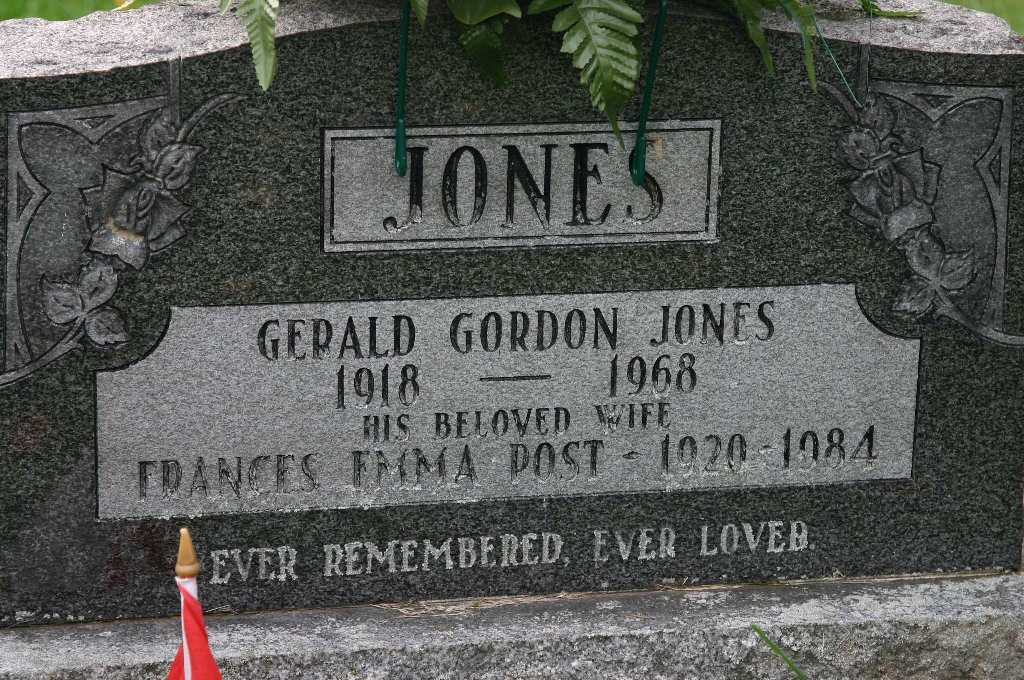 CemSearch: Name: Gerald Gordon Jones; Born: 1918; Died: Aug 10 1968; Age: 50; ID: MTHOPE852; Other names: Post, Frances Emma (1920-1984); Cemetery: Mount Hope Cemetery, Conc A Lot 35, Brighton Twp., Brighton Village, Sec 3 Row 11; Note: Born Brighton; Died Trenton Hospital Son of Evan Jones and Pearl Loveless; Husband of Frances Post; Father of Mildred Baker, Carole Jones, Laura Lloyd, Dianne, and Yvonne. (https://www.cemsearch.ca/burial/?pid=MTHOPE852%5E0.)4,5