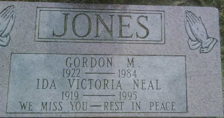 Ida Mary Victoria Neal was born in 1919; Date 1919 per Memorial. per family tree of metchison1 on ancestry.ca, Sep 22 2020.1,2 As of circa 1945,her married name was Jones.1 She married Gordon Manley Jones, son of Evan James M. Jones and Lillian Pearl Loveless, circa 1945; per family tree of metchosin1 on ancestry.ca, Sep 22 2020.1 Ida Mary Victoria Neal was buried in 1995 at Cramahe Hill Cemetery, Cramahe Twp., Northumberland Co., Ontario; Medmorial: (See Exhibit) JONES; Gordon M; 1922 - 1984; Ida Victoria Neal; 1919 - 1995 (Cramahe Hill Cemetery, Cramahe Twp., July 15 2009, by Dan.)2 She died in 1995; Date 1995 per Memorial. per family tree of metchison1 on ancestry.ca, Sep 22 2020.1,2