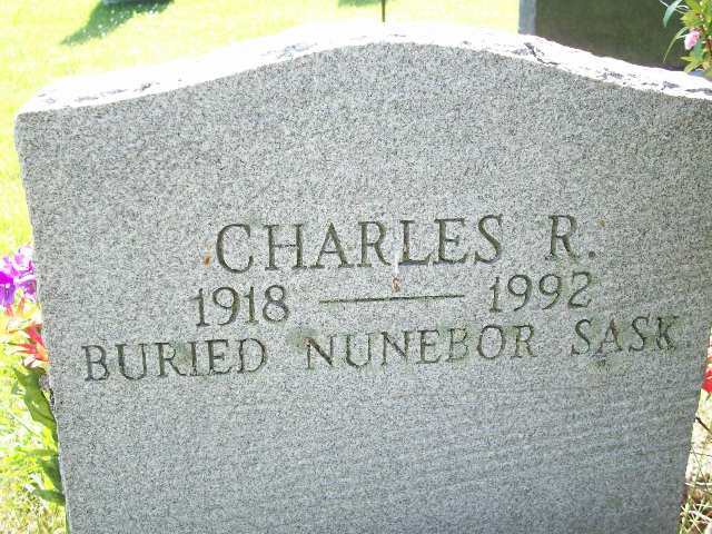Charles Raymond Jones was born on 5 March 1918 at Cramahe Twp., Northumberland Co., Ontario; Date 1918 per Memorial & CemSearch. Date 1918 & location Ont. per 1921 Census. Date Mar 5 1918 & location Castleton per family tree of DonnaCowie39 on ancestry.ca, Sep 25 2020.1,2,3,4 He appeared on the census of 5 June 1921 at Cramahe Twp., Northumberland Co., Ontario; Age 3 at 1921 Census: see Henry Clare Jones.3 He died on 1 June 1992 at Nunebor, Saskatchewan, at age 74; Date 1992 per Memorial. Date 1922 & location Nunebor, Saskastchewan per CemSearch. Date June 1 1992 per family tree of DonnaCowie39 on ancestry.ca, Sep 25 2020.1,2,4 He was buried on 3 June 1992 at Nunebor, Saskatchewan; Memorial: (See Exhibit) Charles R; 1918 - 1992; Buried Nunebor Sask. (Castleton Cemetery, Castleton, July 13 2009, by Dan)