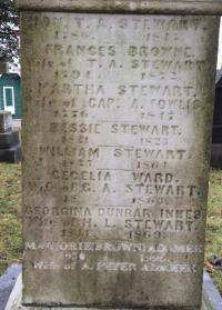 Note: There are a number of lots in this area, Conc 11, 12 that show the Patent going to Thomas A. Stewart, and they all have the date Oct 24 1843. (http://www.biographi.ca/en/bio/stewart_thomas_alexander_7E.html.)4,2 He died on 6 February 1847 at Auburn, Duoro Twp., Peterborough Co., Canada West, at age 60; Date 1847 per Memorial. " ... d. 6 Sept. 1847 in Douro Township, Upper Canada." per Dictionary of Canadian Biography - Thomas Alexander Stewart. (http://www.biographi.ca/en/bio/stewart_thomas_alexander_7E.html) Date Feb 6 1847 & location Auburn, Ont. per family tree of dpgrenon on ancestry.ca, Oct 19 2020.1,2,3 He was buried on 8 February 1847 at Little Lake Cemetery, Peterborough, Peterborough Co., Canada West; Memorial: (See Exhibit) Hon. T. A. Stewart; 1786 - 1847; Frances Browne; Wife of T. A. Stewart; 1791 - 1872; Martha Stewart; Wife Capt. A. Fowlis; 1776-1817; Bessie Stewart; 1821-1823; William Stewart; 1823-1864; Cecelia Ward; Wife of B. A. Stewart; 18?? - 1863; Georgina Dunbar Innes; Wife of H. L. Stewart; 1841 - 1869; Marhorie (Brown) Adamek; 1930-1996; Wife of Peter Adamek (Little Lake Cemetery, Peterborough, from FindaGrave.