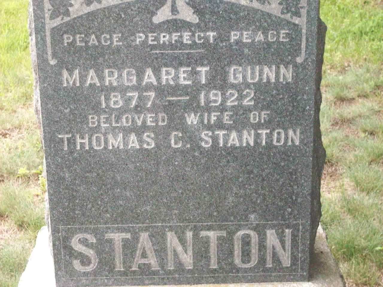 CemSearch: Name: Margaret Stanton; Maiden: Gunn; Born: 1877; Died: 1922; ID: WOODS007; Other names: Stanton, Elizabeth R. [Pearen] (1889-1952), Stanton, Thomas Charles ( - ); Cemetery: Woods Cemetery, Conc 1, Lot 12, Cramahe Twp., Sec N Row 2 Plot 6; Note: Daughter of Donald Gunn and Mary Purvis; married Sept 7 1906 in Brighton to Thomas Charles Stanton 24, labourer born England. Additional information from Northumberland and Durham Marriage Registers. (https://www.cemsearch.ca/burial/?pid=WOODS007%5E0.)3