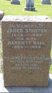 Date 1947 per Memorial & FindaGrave.15,8,9 He was buried on 22 July 1947 at Hamilton Cemetery, Hamilton Twp., Northumberland Co., Ontario; Memorial: (see Exhibit) In Memory of; James Stanton; 1853 - 1947; His Wife; Harriet Ball; 1866 - 1946; Pte. James P.C.O. Stanton; Entered into Restl Oct 11 1921; Aged 21 Years (Hamilton Cemetery, image from FindaGrave.)