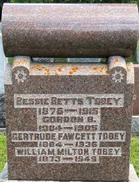 Date 1936 per Memorial.3,7 She was buried on 2 January 1937 at Hillcrest Cemetery, Tara, Bruce Co., Ontario; Memorial: (see Exhibit) Bessie Betts Tobey; 1876-1915; Gordon B; 1904-1905; Gertrude Fawcett Tobey; 1884-1936; William Milton Tobey; 1873-1949 (Hilcrest Cemetery, Tara, Bruce Co., image from FindaGrave.) Date Jan 2 1937 & location Tara Cemetery per marr. reg'n.8,3,4