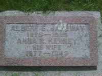 Anna Rebecca Kenney was born on 2 October 1877 at Brighton Twp., Northumberland Co., Ontario; Date 1877 per Memorial. Date 1879 & locaion Ont. per 1921 Census. Date Oct 1878 & location Ont. per 1911 Census. Date Oct 2 1878 & location Ont. urban per 1901 Census. Date 1878 & location Ont. per 1891 Census. Date 1877 & location Brighton per marr. reg'n. Date Oct 1877 per family tree of Jody Comeaux on ancestry.ca, Dec 27 2020.1,2,3,4,5,6,7 She appeared on the census of 12 April 1891 at Brighton Twp., Northumberland East Co., Ontario; Age 13 at 1891 Census: see Agnes Kenney (mother.)6 She lived on 10 January 1899 at Brighton Twp., Northumberland Co., Ontario; Residence Brighton per marriage reg'n.2 As of 10 January 1899,her married name was Janeway.1 She married Albert Edward Janeway, son of Henry Janeway and Elizabeth Acton, on 10 January 1899 at Colborne, Northumberland Co., Ontario; Marriage Reg'n.#... : Groom: A. E. Janeway; Age: 23; Res.: Colborne; Born: Belleville; Status: bachelor; Occ.: Barber; Parents: H. Janeway & E. Acton; Bride: A. R. Kenney; Age: 21; Res. & Born: Brighton; Status: spinster; Parents: Joseph Kenney & A. Irish; Wit.: Wm. Hollis, Colborne & Mina Kenney, Brighton; Date: Jan 10 1899; Place: Colborne; Rel.: Episc. & Pres; Performed by: Rev. A. K. McLean; Reg'd.: Jan 12 1900 (Ontario Marriage Registration, #011687-1900, ancestry.ca) Date Jan 10 1899 & location Northumberland Co. per family tree of Jody Comeaux on ancestry.ca, Dec 27 2020.1,8 Anna Rebecca Kenney appeared on the census of 19 April 1901 at Campbellford, Northumberland Co., Ontario; Age 23 at 1901 Census: see Albert Janeway.3 She appeared on the census of 1911 at Campbellford, Northumberland East Co., Ontario; Age 33 at 1911 Census: see edward Janeway.4 She appeared on the census of 1921 at 458 Aylmer St., Peterborough, Peterborough Co., Ontario; Age 42 at 1921 Census: see Edward Janeway.5 She was buried in 1949 at Salem Cemetery, Cramahe Twp., Salem, Northumberland Co., Ontario; Memorial: (see Exhibit) Albert E. Janeway; 1875 - 1959; Anna R. Kenney; His Wife; 1877 - 1949 (Salem Cemetery, Cramahe Twp., July 6 2009, by Dan.)7 She died in 1949 at Ontario; Date 1949 per Memorial.7
