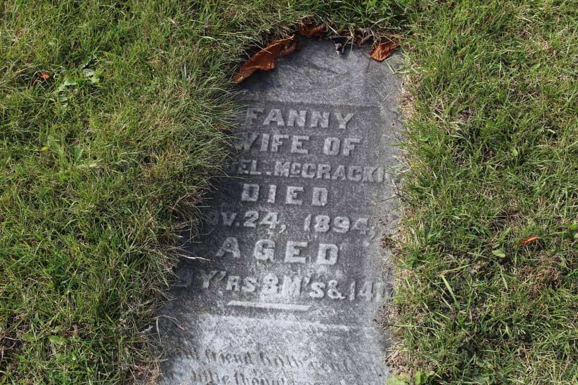 CemSearch: Name: Fanny McCracken; Born: Apr 9 1865; Died: Nov 24 1894; Age: 29; ID: COLBUN454; No other names; Cemetery: Colborne Union Cemetery, Conc 3 Lot 33, Cramahe Twp., Colborne, Sec A-S Row 6 Plot 4; Note: 1st Wife of Samuel McCracken married Dec. 14th, 1892, Mother of Harold J., Dau of George & Fanny Usborne, Info from Ontario Birth & Marriage Registry., Flat old slab (https://www.cemsearch.ca/burial/?pid=COLBUN454%5E0.)1,3