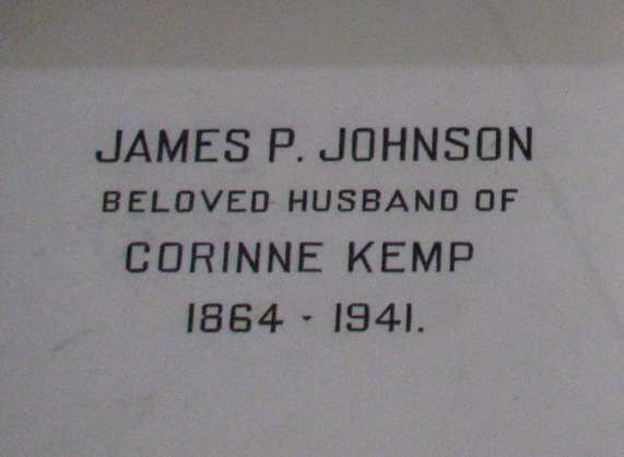 "Muriel Gladys Purdy, only daughter of Mrs. James P. Johnston of Toronto" per marriage notice of Muriel Gladys Purdy.1 James P. Johnson appeared on the census of April 1901 at Ward 3, Toronto Centre, York Co., Ontario; Age 36 at 1901 Census: Johnson, James, 36, b. Ont. u. Dec 11 1864, Eng.. Bapt., manuf., married; Correne, 42, b. Ont. u. July 14 1858, Eng., Bapt., married; Purdy, Muriellle, 17, b. Ont. u. May 18 1883, Eng., Bapt., step-daughter; Johnson, Arthur, 10, b. Ont. u. July 20 1890, son (1901 Census: Toronto Centre, York Co., dist. 3, sub-dist. a-31, pg. 14 - Ward 3 ancestry.ca.)2 He lived on 6 January 1909 at Toronto, York Co., Ontario; "Muriel Gladys Purdy, only daughter of Mrs. James P. Johnston of Toronto" per marriage notice of Muriel Gladys Purdy.1 He lived on 10 December 1918 at 111 Howland Ave., Toronto, York Co., Ontario; Informant for Death Reg'n. of his wife Corinne (Purdy, Kemp) Johnson.4 He died on 27 February 1929 at Ontario at age 64; Date 1941 per Memorial. Date Feb 27 1929 & location Canada per FindaGrave.3,5 He was buried on 1 March 1929 at Forest Lawn Mausoleum, Toronto, York Co., Ontario; Memorial: James P. Johnson; Beloved Husband of; Corinne Kemp; 1864 - 1941 (Forest Lawn Mausoleum, image from FindaGrave.)