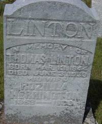 Thomas Linton was born on 13 March 1844 at Hamilton Twp., Northumberland Co., Canada West; Date Mar 13 1844 per Memorial. Date Mar 13 1844 & location Hamilton Twp. per CemSearch. Date 1849 & location Ont. per 1891 Census. Date 1851 & location Brighton Twp. per marriage reg'n. - Rosilla Herrington.1,3,2,4 He appeared on the census of 11 April 1891 at Haldimand Twp., Northumberland West Co., Ontario; Age 42 at 1891 Census: see William Linton.1 He appeared on the census of 17 April 1901 at Haldimand Twp., Northumberland West Co., Ontario; Age 55 at 1901 Census: see John Herrington (further brother-in-law.)5 He married Rozilla Herrington, daughter of Isaac Herrington and Susanna Maria Dusenbury, on 7 August 1905 at Cobourg, Northumberland Co., Ontario; Marriage Reg'n.#014375: Groom: Thomas Linton; Age: 54; Res.: Haldimand Twp; Born: Brighton Twp; Status: bachelor; Occ.: farmer; Parents: William Linton & Agnes Cummings; Bride: Rositte Herrington; Age: 40; Res.: Haldimand Twp; Born: Brighton Twp; Status: spinster; Parents: Isaac Herrington & Susan Dusenbury; Wit.: Marion McCaskill & Emma Bresver, Cobourg; Date: Aug 7 1905; Place: Cobourg; Rel.: Pres. & Meth; Performed by: Wm. Beattie; Reg'd.: Aug 9 1905; Reg'r.: D. H. Minaker, Cobourg (Ontario Marriage Registrations, #014375-1905, ancestry.ca.)6 Thomas Linton lived on 7 August 1905 at Haldimand Twp., Northumberland Co., Ontario; Residence Haldimand Twp. per marriage reg'n. - Rosilla Herrngton.3 He died on 3 June 1930 at Ontario at age 86; Date June 3 1930 per Memorial & CemSearch.2,4 He was buried on 5 June 1930 at Macklin's Cemetery, Haldimand Twp., Northumberland Co., Ontario; Memorial: (see Exhibit) LINTON; In Memory of; Thomas Linton; Born Mar. 13, 1844; Died June 3, 1930; His Wife; Rozilla; Herrington; 1858- 1933 (Macklin's Cemetery, Haldimand Twp., by Dan)
