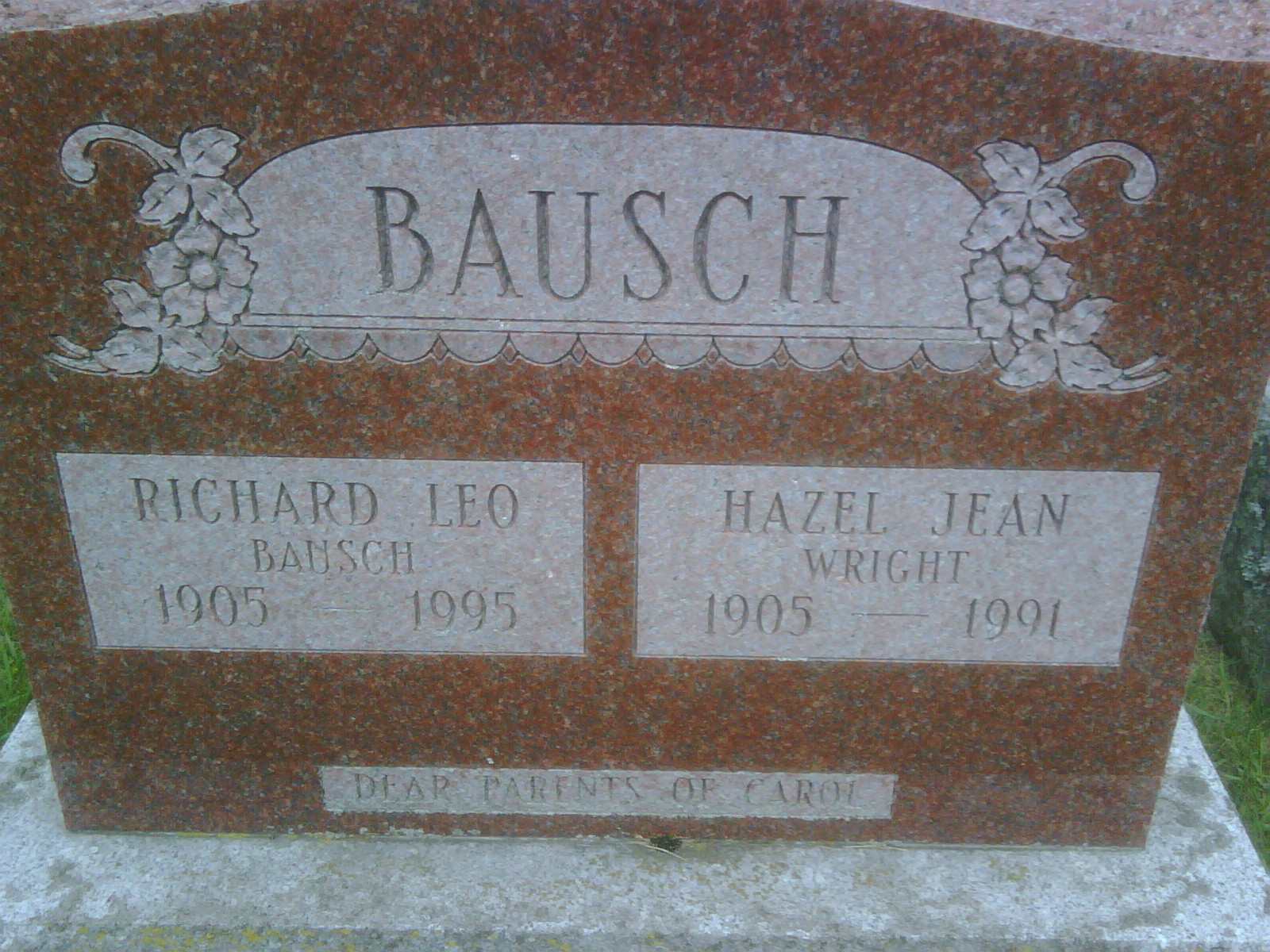 Hazel Jean Wright was born on 16 November 1905 at Cramahe Twp., Northumberland Co., Ontario; Birth Reg'n.#050431: Name: Hazel Jean Wright; Date: Nov 16 1905; Parents: John Wright & Maud McDonald; Inf.: John Wright, father, Cramahe Twp; Phys.: Dr. Sargent; Reg'd.: Sep. 11 1906 (Ontario Birth Registration, #050431-1905, ancestry.ca) Date 1905 per Memorial.2,3 She appeared on the census of 8 June 1921 at William St., Port Hope, Durham Co., Ontario; Age 15 at 1921 Census: see John Wright.4 As of circa 1930,her married name was Bausch.3 She married Richard Leo Bausch circa 1930; per Memorial.3 Hazel Jean Wright was buried in 1991 at Salem Cemetery, Cramahe Twp., Salem, Northumberland Co., Ontario; Memorial: (see Exhibit) BAUSCH; Richard Leo; Bausch; 1905 - 1995; Hazel Jean; Wright; 1905 - 1991; Dear Parents of Carol (Salem Cemetery, Cramahe Twp., July 4 2009, by Dan.)3 She died in 1991 at Ontario; Daet 1991 per Memorial.3