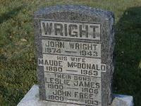 CemSearch: Name: John Wright; Born: 1874; Died: 1943; ID: SALEM0710; Other names: Wright, John Free (1908-1913), Wright, Leslie James (1900-1905), Wright, Maude [McDonald](1880-1953); Cemetery: Salem Cemetery, Conc 1, Lot 21, Cramahe Twp., Northumberland Co., Village of Salem, Sec 2 Row 10 Plot 15; Note: Husband of Maude McDonald, Father of Leslie James &