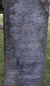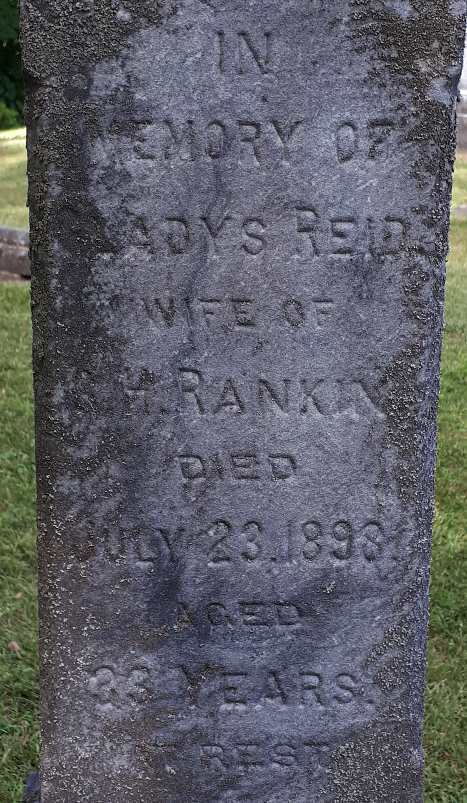 Gladys Reid was born on 20 May 1865 at Hastings Co., Canada West; Date 1865 & location Ont. per 1891 Census. Date May 20 1865 & location Hastngs Co. per family tree of DKGM02 on ancestry.ca, Sep 2 2021.1,4 As of 6 October 1886,her married name was Rankin.1 She married Gifford Herber Rankin, son of John Rankin and Perlina Locie, on 6 October 1886 at Thurlow Twp., Hastings Co., Ontario; Marriage Reg'n.#004372: Groom: Gifford Heber Rankin; Age: 23; Res.: Belleville; Born: Murray Twp; Status: bachelor; Occ.: baker; Parents: John & Phoebe P. Rankin; Bride: Gladys Reed; Age: 21; Res. & Born: Thurlow Twp; Status: spinster; Parents: Sylvester & Mary Jane Reed; Wit.: Charles Wright, Huntingdon Twp. & Isabella Reed, Thurlow Twp; Date: Oct 6 1886; Place: Thurlow Twp; Rel.: Bapt; Performed by: Rev. E. E. Howard (Ontario Marriage Registration, #004372-1886, ancestry.ca) Date Oct 6 1886 per family tree of DKGM02 on ancestry.ca, Sep 2 2021.1,5 Gladys Reid appeared on the census of 23 April 1891 at Belleville, Hastings West Co., Ontario; Age 26 at 1891 Census: see Gifford Rankin.4 She died on 23 July 1898 at Brighton Twp., Smithfield, Northumberland Co., Ontario, at age 33; Date July 23 1898 per CemSearch. Date Jul 23 1898 & location Smithfield per family tree of DKGM02 on ancestry.ca, Sep 2 2021.1,2 She was buried on 25 July 1898 at Mount Carmel Cemetery, Murray Twp., Northumberland Co., Ontario; CemSearch: Name: Gladys Rankin; Maide: Reid; Born: - ; Died: Jul 23 1898; ID: MTCRML124; Other names: Rankin, James R. ( -1917); Cemetery: Mount Carmel, Conc B, Lot 21, Murray Twp., Northumberland Co., Row 12; Note: Wife of G.H. Rankin Probably Gibbard Herbert Rankin, Son of John Rankin and Perlina Locie. Mother of James R. Rankin. (https://www.cemsearch.ca/burial/?pid=MTCRML124%5E0.)2