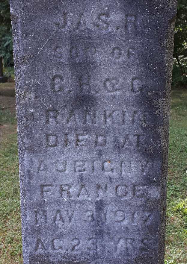 CemSearch: Name: James R. Rankin; Born: - ; Died: May 3 1917; ID: MTCRML124; Other names: Rankin, Gladys [Reid] ( -1898); Cemetery: Mount Carmel, Conc B, Lot 21, Murray Twp., Northumberland Co., Row 12; Note: Died At Aubigny France May 3, 1917. Son of G.H. and C. Rankin. (https://www.cemsearch.ca/burial/?pid=MTCRML124%5E1.)5,6
