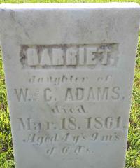 FindaGrave: Name: Harriet Adams; BIRTH: 12 Jan 1860; DEATH: 18 Mar 1861 (aged 1); BURIAL: Carman Cemetery, Carman, Northumberland County, Ontario, Canada; PLOT: Row 7; MEMORIAL ID: 113276110 (https://www.findagrave.com/memorial/113276110/harriet-adams)