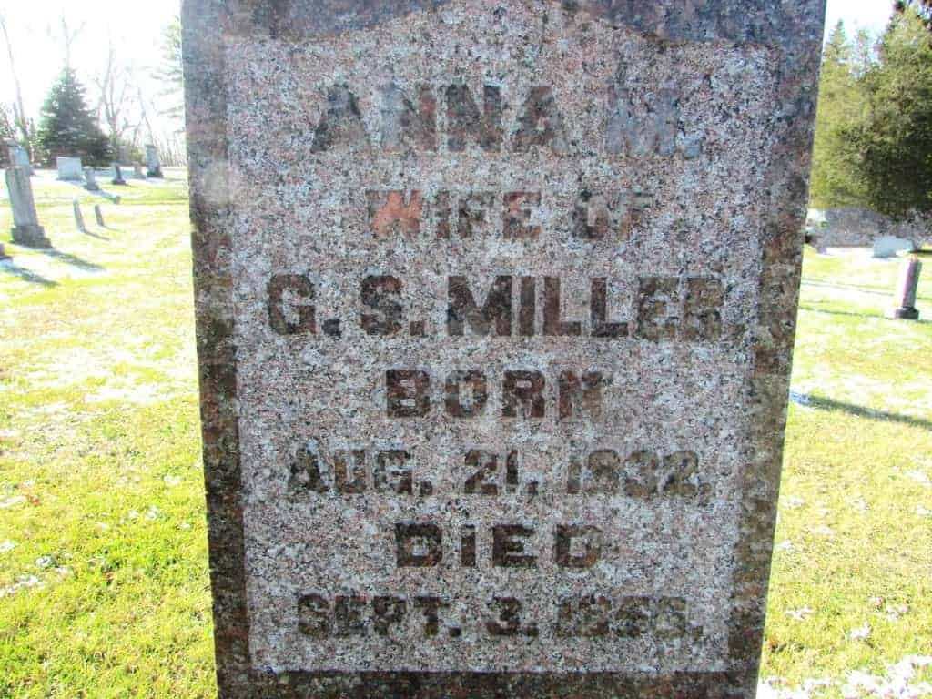 CemSearch: Name: Anna M. Miller; Born: Aug 21 1832; Died: Sep 3 1856; ID: CRYPLCCP0233; Other names: Miller, George S. (1832-1905), Miller, Eleanor M. (1835-1900); Cemetery: Carrying Place Cemetery, Conc C, Lot 9, Murray Twp., Northumberland Co; Note: 1st wife of George S. Miller. (https://www.cemsearch.ca/burial/?pid=CRYPLCCP0233%5E2.)1,2