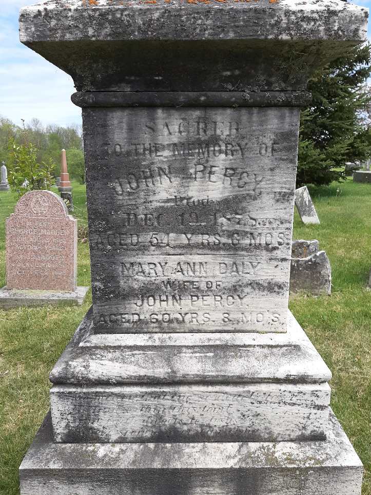FindaGrave: Name: John Percy; BIRTH unknown; DEATH: 19 Dec 1878; BURIAL: Newburgh United Church Cemetery, Newburgh, Lennox and Addington County, Ontario, Canada; MEMORIAL ID: 213924167; Note: Aged 54 Y'rs. 6 Mo's; Mary Ann Daly wife of John Percy Aged 60 Yrs. 8 Mos. (https://www.findagrave.com/memorial/213924167/john-percy)