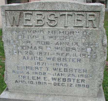 Thomas Henry Webster was born on 26 December 1870 at Markham Twp., Cashel, York Co., Ontario; Birth Reg'n.#014066: Name: Thomas Henry Webster; Date: Dec 26 1870; Parents: William Webster & Hannah Cooper; Inf.: William Webster, farmer, Cashel; Reg'd.: Jan 20 1871; Reg'r.: Geo. Eakins, Markham Twp. (Ontario Birth Registration, #014066-1870, ancestry.ca) Date Dec 26 1871 per Memorial. Date 1871 & location Markham Twp. per marriage reg'n. - Alice Thompson.4,3 He lived on 12 January 1899 at York Twp., York Co., Ontario; Residence York Twp. per marriage reg'n. - Alice Thompson.1 He married Alice Louisa Thompson, daughter of James Thompson and Margaret Glass, on 12 January 1899 at York Twp., York Co., Ontario; Marriage Reg'n.#... : Groom: Thomas H. Webster; Age: 28; Res.: York Twp; Born: Markham Twp; Status: bachelor; Occ.: farmer; Parents: William Webster & Hannah Cooper; Bride: Alice Thompson; Age: 27; Res.: York Twp; Born: King Twp; Status: spinster; Parents: James Thompson & Margaret Glass; Wit.: Wm. Webster & Ida Thompson, York Twp; Date: Jan 12 1899; Place: York Twp; Re.: Meth. & Episc; Performed by: Jas. Grant; Reg'd.: Jan 13 1899; Reg'r.: M.A. Clarke, York Twp. (Ontario Marriage Registration, #017450-1899, ancestry.ca)(Note: Day is not clear, assuming 12th due to reg'n. 13th.)5 Thomas Henry Webster died on 11 September 1925 at Ontario at age 54; Date Sep 11 1925 per Memorial.3 He died on 13 September 1925 at Mount Pleasant Cemetery, Toronto, York Co., Ontario, at age 54; Memorial: (see Exhibit) WEBSTER; In Loving Memory of; Olive I. Webster; Sep 29 1906 - Apr. 13, 1923; Thomas H. Webster; Dec 26 1871 - Sep 11, 1925; Alice Webster; 1871 - 1955; Ernest T. Webster; Sep 4, 1902 - Jan 25, 1982; Helen E. Webster; Aug 10, 1915 - Dec 12, 1998 (Mount Pleasant Cemetery, Toronto, image from FindaGrave, Mar 22 2022.)3