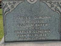 CemSearch: Name: Ella M. Clindinin; Maiden: Baker; Born: Oct 31 1839; Died: Oct 17 1902; Age: 63y; ID: MTCRML055; Other names: Clindinin, C. J. Russell ( -1872), Clindinin, Charles (1836-1926), Clindinin, Finley (1875-1921); Cemetery: Mount Carmel Cemetery, Conc B, Lot 21, Murray Twp., Northumberland Co, Row 6; Note: Daughter of Thomas and Harriet Baker of Huntington; Marr. Charles Clindinin Aug. 31 1864. Mother of Herbert, C.J. Russell, Finley, and Hattie Victoria. (https://www.cemsearch.ca/burial/?pID=MTCRML055%5E1.)1,2