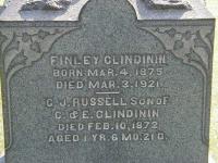 CemSearch: Name: Finley Clindinin; Born: Mar 4 1875; Died: Mar 3 1921; Age: 46y; ID: MTCRML055; Other names: Clindinin, C. J. Russell ( -1872), Clindinin, Ella M. [Baker] (1839-1902), Clindinin, Charles (1836-1926); Cemetery: Mount Carmel Cemetery, Conc B, Lot 21, Murray Twp., Northumberland Co, Row 6; Note: Son of Charles Clindinin and Ella Baker. (https://www.cemsearch.ca/burial/?pID=MTCRML055%5E2.)1,2