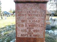 CemSearch: Name: Robert G. Weddell; Born: Aug 21 1880; Died: Sep 11 1960; Age: 80y 1m; ID: CRYPLCCP196; Other names: Weddell, Jessie [Young] (1852-1890), Weddell, Mary [Girdwood] (1821-1890), Weddell, Robert (1850-1919), Weddell, Robert Sr. (1821-1898), Weddell, Woneita [Snell] (1885-1942); Cemetery: Carrying Place Cemetery, Conc C, Lot 9, Murray Twp., Northumberland Co., Carrying Place Village; Note: Husband of Woneita (?) (-1942); Son of Robert (1850-1919); Grandson of Robert, Sr. (1821-1898) (https://www.cemsearch.ca/burial/?pid=CRYPLCCP0196%5E4.)1,4