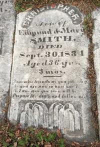 Son of Edmund & Mary SMITH, DIED Sept. 30, 1834, Aged 36 yrs. 3 mos. (https://www.findagrave.com/memorial/155763544/christopher-smith?_gl=1*1st530v*_ga*MTM2OTMxODYxNS4xNjM1ODgwODE4*_ga_4QT8FMEX30*MTY1NDAwODU2OC43NC4xLjE2NTQwMDk3MzQuMA..)