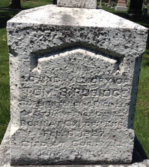 FindaGrave: Name: Tom S Rubidge; BIRTH: 5 Feb 1827, England; DEATH: 21 Jun 1904 (aged 77), Stormont, Dundas and Glengarry United Counties, Ontario, Canada; BURIAL: Woodlawn Cemetery, Cornwall, Stormont, Dundas and Glengarry United Counties, Ontario, Canada; MEMORIAL ID: 175874518 (https://www.findagrave.com/memorial/175874518/tom-s-rubidge?_gl=1*kferc3*_ga*MTM2OTMxODYxNS4xNjM1ODgwODE4*_ga_4QT8FMEX30*MTY1NTY2NTgzMC4xMDMuMS4xNjU1NjY4MjUzLjA.)2