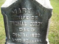 CemSearch: Name: Mary A. Corby; Born: - ; Died: Dec 31 1889; Age: 82y; ID: MTHOPE219; Other names: Corby, Agnes ( -1889), Corby, Thomas Sr. ( -1900), Corby, Thomas R. (Jr.) ( -1917); Cemetery: Mount Hope Cemetery, Conc A, Lot 35, Brighton Twp., Village of Brighton, Northumberland Co., Sec 1 Row 11; Note: Born In Ealing County, Middlesex, England. Wife of Thomas Corby (Sr.) .Mother of Thomas Corby (Jr.) (https://www.cemsearch.ca/burial/?pid=MTHOPE219%5E1.)3,4