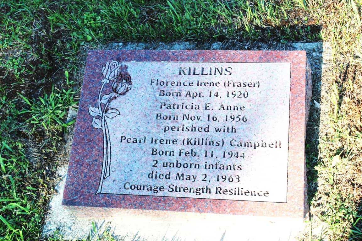 Memorial: (see Exhibit) KILLINS; Florence Irene (Fraser); Born Apr. 14, 1920; Patricia E. Anne; Born Nov. 16, 1956; perished with; Pearl Irene (Killins) Campbell; Born: Feb. 11, 1944; 2 unborn infants; died May 2, 1963; Courage Strength Resilience (Fairview Cemetery, image from CemSearch, Aug 2 2022)