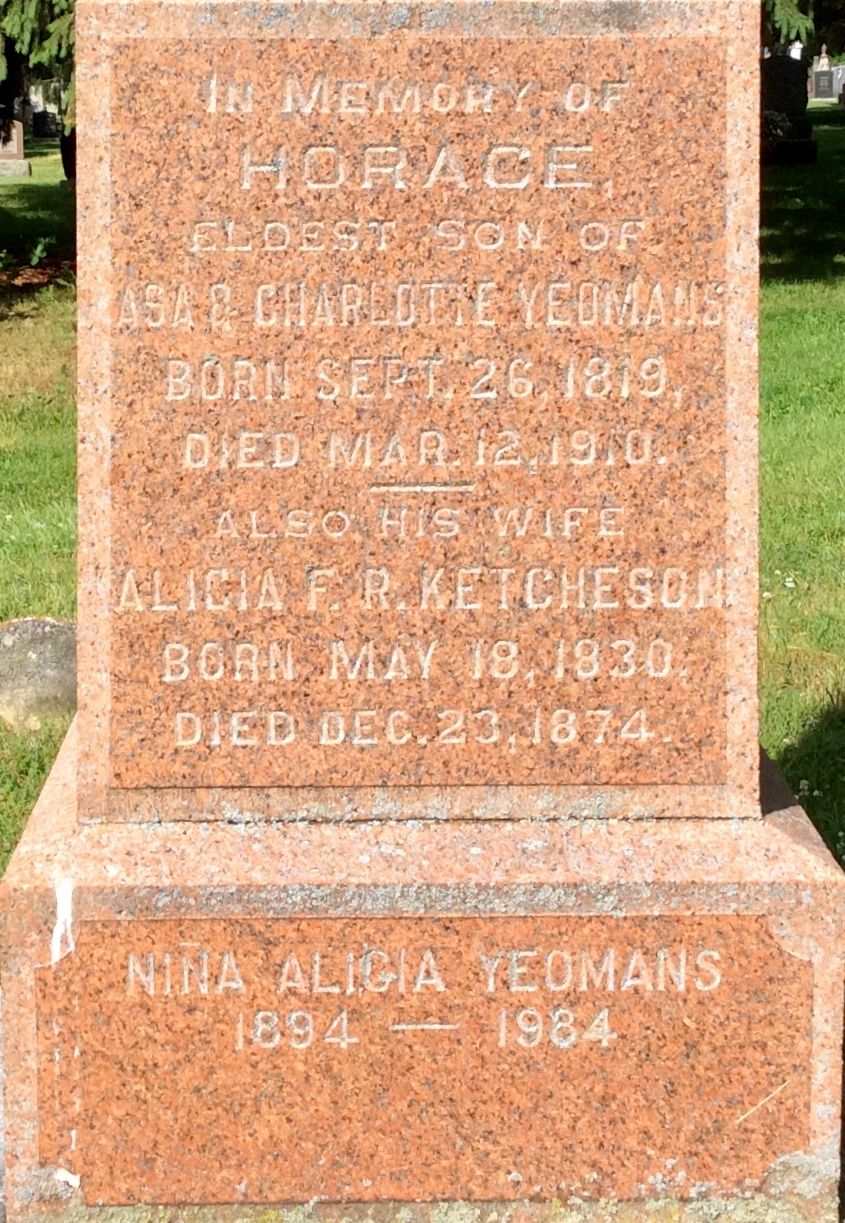 Note: Horace Yeomans was 18 when Billa Flint started up the saw mill in Belleville. By the 1851 Census, when he is 32, his is listed as a "Lumber Dealer". in 1837 at Belleville, Hastings Co., Upper Canada.8 He married Ann ? circa 1849 at Canada West; per 1851 Census.2 Horace Alfred Yeomans appeared on the census of 1851 at Belleville, Hastings Co., Canada West; Age 32 at 1851 Census: Yeomans, Horace, 32, b. Cda., WM, Lumber Dealer, married; Ann, 25, b. Cda., WM, married; Charlotte, 1 (1851 Census: Belleville, Hastings Co., pg. 29 of 92, line 29 - ancestry.ca.)2 He married Alicia Fenton Russell Ketcheson, daughter of Elijah Ketcheson and Martha Minerva Jane Ostrom, on 14 March 1860 at Belleville, Hastings Co., Canada West; per family tree of Douglas Carter on ancestry.ca, Aug 12 2022.1 Horace Alfred Yeomans appeared on the census of April 1861 at Belleville, Hastings Co., Canada West; Age 44 at 1861 Census: Yeomans, Horace, 44, b. UC, WM, saw miller, married; Alicia, 30, b. UC, WM, married (1861 Census: Town of Belleville, Hastings Co., pg. 473 of 983, line 32 - ancestry.ca.)6 He appeared on the census of April 1871 at Belleville, Hastings West Co., Ontario; Age 50 at 1871 Census: Yeomans, Horace, 50, b. Ont., Eng., WM, lumber dealer, married; Elicia, 40, b. Ont., Eng., WM, married; Lottie, 11, b. Ont., Eng., WM; Clara, 9; Horace, 6; Bessie, 3; Mary, 2; Johnson, Mary, 16, b. Ont., Irish, RC, servant, single; Kinady,m Jane, 25, b. Ont., Irish, RC, servant, single (1871 Census: Town of Belleville, Hastings West Co., dist. 60, sub-dist. C-4, pg. 110, line 18 - ancestry.ca) (Note: Mrs. A. Yeomans, age 68, is above. Also note Lottie, from his first marriage.)7 He died on 12 March 1910 at West Bridge St., Belleville, Hastings Co., Ontario, at age 90; Death Reg'n.#013891: Name: Horace Yeomans; Date: Mar 12 1910; Age: 90y 5m 14d; Res.: W. Bridge St., Belleville; Born: Cda. Sep 26 1819; Occ.: retired lumberman; Status: widower; Parents: Asa Yeomans, b. USA & Charlotte Herchimer, b. Cda; Cause: senility, cerebral apoplexy, one week; Phys. & Inf.: Dr. Horace A. Yeomans, Belleville; Reg'd.: March 12 1910; Reg'r.: W.C. Mikel, Belleville (Ontario Death Registration, #013891-1910, ancestry.ca) Date Mar 12 1910 per Memorial. Date Mar 12 1910 & location Belleville per FindaGrave. Date Mar 12 1910 & location Belleville per family tree of Douglas Carter on ancestry.ca, Aug 12 2022.1,9,5,3 He was buried on 14 March 1910 at Belleville Cemetery, Belleville, Hastings Co., Ontario; Memorial: (see Exhibit) In Memory of; Horace; Eldest Son of; Asa & Charlotte Yeomans; Born Sept. 26, 1819; Died Mar. 12, 1910; Also His Wife; Alicia F.R. Ketecheson; Born May 18, 1830; Died Dec. 23, 1874; Nina Alicia Yeomans; 1894 - 1984) (Belleville Cemetery, Belleville, image from FindaGrave, Aug 12 2022)