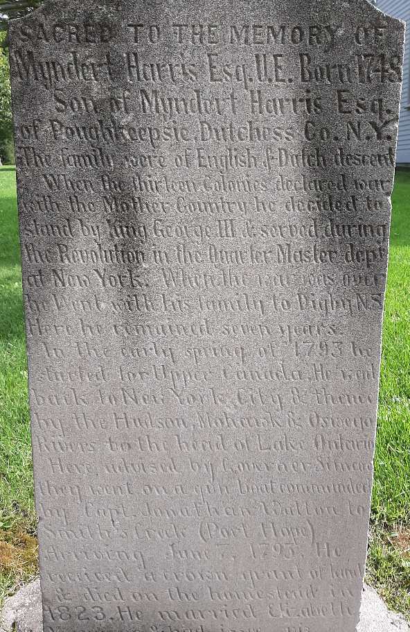 FindaGrave: Name: Myndert Harris; BIRTH: 1748; DEATH: 1823 (aged 74–75); BURIAL: Saint Mark's Anglican Church Cemetery, Port Hope, Northumberland County, Ontario, Canada; MEMORIAL ID: 198428430 (https://www.findagrave.com/memorial/198428430/myndert-harris.)2