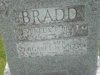 Margaret H. "Maggie" Millar was born on 29 January 1868 at Sidney Twp., Hastings Co., Ontario; Date 1868 per Memorial & CemSearch. Date Jan 29 1869 & location Ont. rural per 1901 Census. Date 1869 & location Ont. per 1891 Census. Date 1868 & location Ont. per 1881 Census. Date 1868 & location Ont. per 1871 Census. Date 1868 & location Sidney Twp. per marriage reg'n. - Devereux Fuller Bradd.1,3,2,4,5,6,7 She appeared on the census of April 1871 at Sidney Twp., Hastings West Co., Ontario; Age 3 at 1871 Census: see Archibald Millar.6 She appeared on the census of April 1881 at Cramahe Twp., Northumberland East Co., Ontario; Age 13 at 1881 Census: see Archibald Millar.5 She appeared on the census of 13 April 1891 at Brighton Twp., Northumberland East Co., Ontario; Age 22 at 1891 Census: see Archibald Millar.7 She lived on 31 July 1895 at Brighton Twp., Northumberland Co., Ontario; Residence Brighton Twp. per marriage reg'n. - Maggie Miller.2 As of 31 July 1895,her married name was Bradd.1,2 She married Devereux Fuller Bradd, son of John Bradd and Jane Mason, on 31 July 1895 at Brighton, Northumberland Co., Ontario; Marriage Reg'n.#008557: Groom: Deverex Fuller Bradd; Age: 40; Res. & Born: Cramahe Twp; Status: bachelor; Occ; farmer; Parents: John Brade & Jane Mason; Bride: Maggie Miller; Age: 27; Res.: Brighton Twp; Born: Sidney Twp; Status: spinster; Parents: Archibald Miller & Margaret Lee?; Wit.: James Miller, Brighton Twp. & Edith Squier, London, Ont; Date: Jul 31 1895; Place: Brighton Twp; Rel.: Pres; Peformed by: Rev. A. ?? McLeod; Reg'r.: A.A. Becker, Brighton Twp. (Ontario Marriage Registration, #008557-1895, ancestry.ca.)1,8 Margaret H. "Maggie" Millar appeared on the census of 4 April 1901 at Cramahe Twp., Northumberland East Co., Ontario; Age 33 at 1901 Census: see Devereux Bradd.3 She died in 1963 at Ontario; Date 1963 per Memorial & CemSearch.1,4 She was buried in 1963 at Salem Cemetery, Cramahe Twp., Salem, Northumberland Co., Ontario; Memorial: (see Exhibit) BRADD; Devereux F. Bradd; 1857 - 1926; Hiw Wife; Margaret H. Millar; 1868 - 1963 (Salem Cemetery, Cramahe Twp., image by Dan Buchanan, Jul 6 2009)