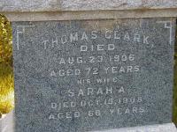 CemSearch: Name: Thomas Clark; Born: 1834; Died: Aug 23 1906; Age: 72y; ID: WOODS092; Other names: Clark, George W. Lawson (1910-1914), Clark, Margaret M. [Weller] (1870-1930), Clark, Sarah A. (1842-1908), Clark, John A. (1862-1936); Cemetery: Woods Cemetery, Conc 1, Lot 12, Cramahe Twp., Northumberland Co., Sec S Row 14 Plot 13; Note: Husband of Sarah A. (https://www.cemsearch.ca/burial/?pid=WOODS092%5E0.)4,5