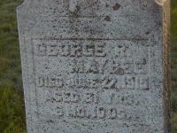"The Late George Maybee. After a few days illness, of which only a few of his friends were aware, George R. Maybee passed peacefully away on Tuesday, June 22nd in his 82nd year. Mr. Maybee was born in Prince Edward county. When a boy he moved with his parents to Tyendinaga township, Hastings county, where his parents died, and following their death, the care of four sisters and three brothers devolved upon him at the age of 18. About two years later, he moved to Murray township where he resided or many years. At 45 he married Mrs. Ann Meredith, and moved to Brighton where he has resided for thirty-seven years, during which time he gained many friends. Mr. Maybee had a remarkable memory and could narrate incidents of years gone by with great interest. In politics he was a staunch Conservative. His sister, Mrs. Thomas Corby, Brighton, is the only surviving member of the family. The funeral service was conducted by the Rev. S. H. Lamb, at his residence, on Wednesday June 23rd, and interment took place at Wood's cemetery." from pg. 030 of Newspaper Clippings, a collection donated by Shawnee Spencer to the Brighton Digital Archives, 2022.12,13 He was buried on 24 June 1915 at Woods Cemetery, Cramahe Twp., Northumberland Co., Ontario; Memorial: (see Exhibit) George R; Maybee; Died June 22, 1915; Aged 81 Y'rs; 6 Mo.s, 10 D.s (Woods Cemetery, Cramahe Twp., image by Dan Buchanan, Jul 3 2004) Location Woods Cemetery per Death Reg'n.1,8