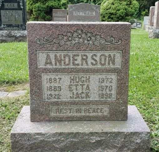 "Married. Anderson - Terry: At the Presbyterian Manse, on Wednesday. Feb. 9, 1916, by the Rev. A. K. McLeod, Etta E. H. Terry and Hugh W. Anderson, both of Brighton." from pg. 030 of Newspaper Clippings, a collection donated by Shawnee Spencer to the Brighton Digital Archives, 2022.3,4 Hugh Wood Anderson was buried in 1972 at Mount Hope Cemetery, Brighton, Northumberland Co., Ontario; Memorial: (see Exhibit) ANDERSON; 1887 Hugh 1972; 1889 Etta 1970; 1922 Jack 1998 (Mount Hope Cemetery, Brighton, image from FindaGrave, 2022 12 27.)2 He died in 1972 at Ontario; Date 1972 per Memorial.2