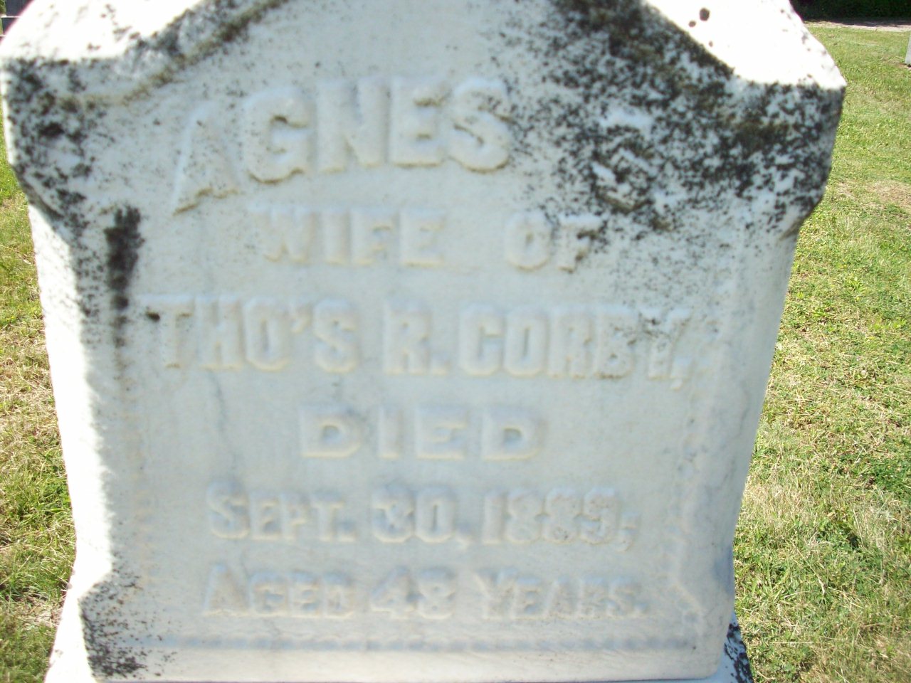 CemSearch: Name: Agnes Corby; Born: - ; Died: Sep 30 1889; Age: 48y; ID: MTHOPE219; Other names: Corby, Mary A. ( -1889), Corby, Thomas Sr. ( -1900), Corby, Thomas R. (Jr.) ( -1917); Cemetery: Mount Hope Cemetery, Conc A, Lot 35, Brighton Twp., Village of Brighton, Northumberland Co., Sec 1 Row 11; Note: Wife of Thomas R. Corby (Jr.) (https://www.cemsearch.ca/burial/?pid=MTHOPE219%5E3.)4,5