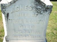 Agnes Sarah Slicer was born in 1841 at Canada West; Date 1841 per Memorial & CemSearch. Date 1842 & location Ont. per 1881 Census. Date 1842 & location Ont. per 1871 Census. per family tree of stimersgenealogy on ancestry.ca, Feb 10 2023.1,2,3,4,5 As of 2 July 1863,her married name was Corby.1 She married Thomas Richard Corby, son of Thomas Corby and Mary Ann Allen, on 2 July 1863 at Kingston, Frontenac Co., Canada West; per family tree of stimersgenealogy on ancestry.ca, Feb 10 2023.1 Agnes Sarah Slicer appeared on the census of April 1871 at Brighton, Northumberland East Co., Ontario; Age 29 at 1871 Census: see Thomas R. Corby.3 She appeared on the census of April 1881 at Brighton, Northumberland East Co., Ontario; Age 39 at 1881 Census: see Thomas R. Corby.2 She died on 30 September 1889 at Brighton, Northumberland Co., Ontario; Date Sep 30 1889 per Memorial & CemSearch. Date Sep 20 1889 & location Brighton per family tree of stimersgenealogy on ancestry.ca, Feb 10 2023.1,4,5 She was buried on 2 October 1889 at Mount Hope Cemetery, Brighton, Northumberland Co., Ontario; Memorial: (see Exhibit) Agnes S; Wife of; Tho's R. Corby; Died; Sept. 30, 1889; Aged 48 Years (Mount Hope Cemetery, Brighton, image by Dan Buchanan, Jun 6 2009)