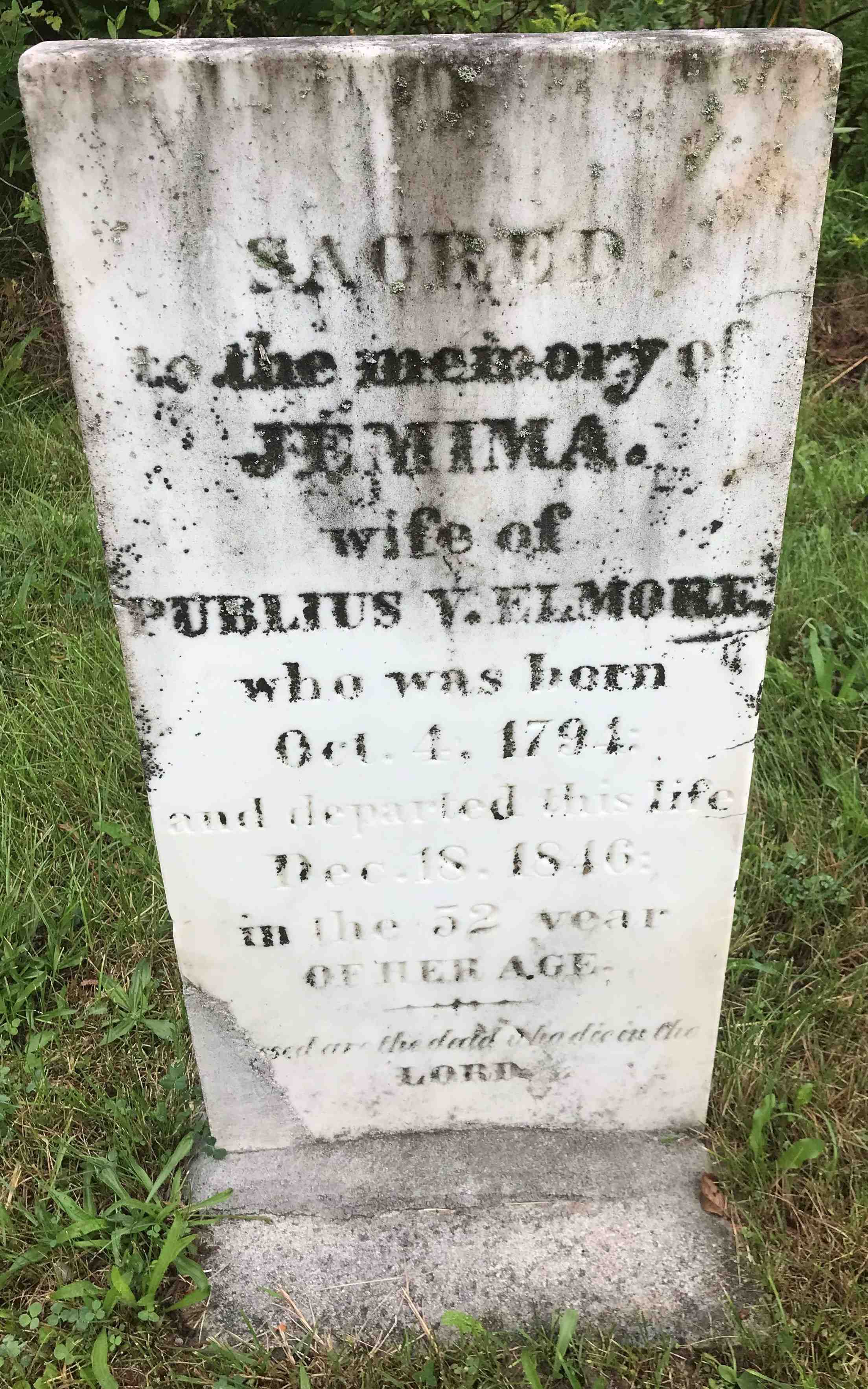 CemSearch: Name: Jemima Elmore; Born: Oct 4 1794; Died: Dec 18 1846; Age: 52y; ID: PEHL161660; No other names; Cemetery: Glenwood Cemetery, Picton, Prince Edward Co., Sec N Plot 41; Note: Wife of Publius V. (https://www.cemsearch.ca/burial/?pid=PEHL161660%5E0)