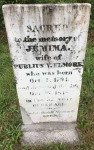 FindaGrave: Name: Jemima Elmore; BIRTH: 4 Oct 1794; DEATH: 18 Dec 1846 (aged 52); BURIAL: Glenwood Cemetery, Picton, Prince Edward County Municipality, Ontario, Canada; PLOT: Section N Block 540 Grave 10; MEMORIAL ID: 170022095; Note: Gravesite Details: One of numerous graves moved from the Wesleyan Methodist Cemetery in Picton to Glenwood Cemetery in the late 1800s. Glenwood staff have repaired and restored a group of these headstones in a memorial. (https://www.findagrave.com/memorial/170022095/jemima-elmore)