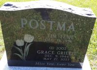 Grace Grietje Hilwerda was born on 9 December 1944 at Ontario; Date Dec 9 1944 per Obit.2 As of 2002,her married name was Postma.2 She died on 27 May 2023 at Brighton, Northumberland Co., Ontario, at age 78; "Grace Hilwerda Obituary. We are sad to announce that on May 27, 2023, at the age of 78, Grace Hilwerda (Brighton, Ontario) passed away. Leave a sympathy message to the family on the memorial page of Grace Hilwerda to pay them a last tribute. She was loved and cherished by many people including : her parents, Andrew Hilwerda and Jeertsje; her husband Tim Postma; her children, Ed and Dorothy Colgan (Jason); her step-son John Postma (Ronnie); her siblings, Marjorie (late Andy), Gary (Dale) and Jennie (Roger); and her siblings-in-law, Walter Postma, Bob (Ann), Mary (Nick), Elsie (late Jerry), Tena (Garth), Gord (Jill) and Alice (Steve). She was also cherished by her six grandchildren, six great-grandchildren, and her many, many nieces and nephews. Visitation was held on Monday, June 5th 2023 from 1:00 PM to 2:00 PM at the Rushnell Funeral Homes - Brighton (130 Main St, Brighton, ON K0K1H0). A memorial service was held on Monday, June 5th 2023 at 2:00 PM at the same location. As an expression of sympathy, memorial donations in memory of Grace may be made to the ENSS Music / Art Department (s) is appreciated." https://www.echovita.com/ca/obituaries/on/brighton/grace-hilwerda-16467092.)2 She was buried on 30 May 2023 at Mount Hope Cemtery, Brighton, Northumberland Co., Ontario; Memorial: (see Exhibit) POSTMA; Tim Teijte; Dec 19, 1936; = ; 00 2002; Grace Grietje; Dec 9, 1944; May 27, 2023 (Mount Hope Cemetery, Brighton, image by Dan Buchanan, Jun 29 2025.)1