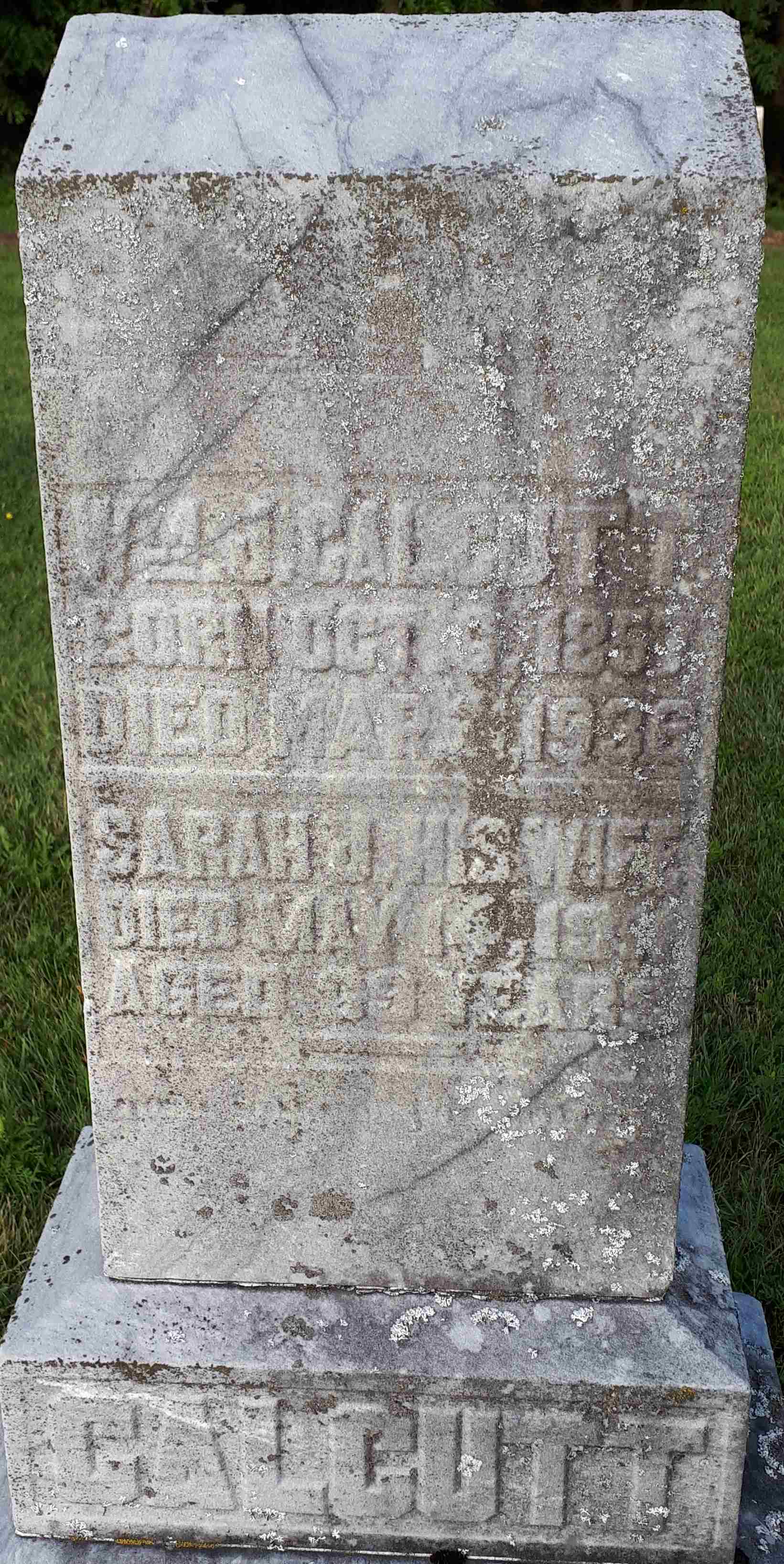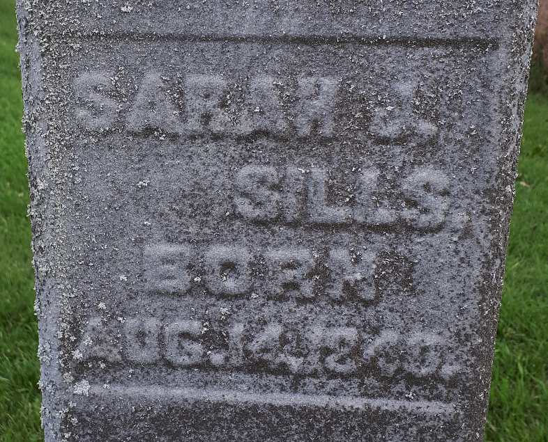 Sarah Jane Armstrong was born on 14 August 1840 at Cavan Twp., Durham Co., Upper Canada; Date Aug 14 1840 per Memorial. Date 1840 & location Ont. per Death Reg'n. - age 76 at death Dec 8 1916. Date Aug 14 1840 & locaiton Ont. rural per 1901 Census. Date 1832 & location Ont. per 1891 Census. Date 1841 & location Ont. per 1881 Census. Date 1841 & location Ont. per 1871 Census. Date 1840 & location England per 1861 Census. Date 1840 & location Northumberland Co. per marriage reg'n. - Henry Smith. Date 1843 & location Cavan, Durham Co. per marriage reg'n. - Charles Sills.1,2,3,4,5,6,7,8 As of circa 1856,her married name was Calcutt.9 She married John Calcutt circa 1856 at Canada West; "Husband of Sarah" per CemSearch. Date c. 1856 per 1871 Census - son John age 14 - but not in 1861 Census???9,3 Sarah Jane Armstrong appeared on the census of April 1861 at Murray Twp., Northumberland Co., Canada West; Age 21 at 1861 Census: see John Cockett.2 She appeared on the census of April 1871 at Murray Twp., Northumberland Co., Ontario; Age 30 at 1871 Census: see John Calcutt.3 As of 4 November 1880,her married name was Smith.1 She lived on 4 November 1880 at Murray Twp., Northumberland Co., Ontario; Residence Murray Twp. per marriage reg'n. - Henry Smith.1 She married Henry Smith, son of James Smith and Ann ?, on 4 November 1880 at Trenton, Hastings Co., Ontario; Marriage Reg'n.#003916: Groom: Henry Smith; Age: 68; Res.: Brighton Twp; Born: Ireland; Status: widower; Occ.: farmer; Parents: James & Ann Smith; Bride: Sarah Jane Calcutt; Age: 40; Res.: Murray Twp; Born: Northumberland Co; Status: widow; Parents: John & Margaret Armstrong; Wit.: Dinah Cummings & Adeline Gilbert, Belleville; Date: Nov 4 1880; Place: Trenton; Rel.: EM; Performed by: Rev. Francis Finn; Reg'r.: Jerh Simmons, Trenton (Ontario Marriage Registration, #033916-1880, ancestry.ca.)10 Sarah Jane Armstrong appeared on the census of April 1881 at Murray Twp., Northumberland Co., Ontario; Age 40 at 1881 Census: see Henry Smith.7 She lived on 29 August 1882 at Murray Twp., Northumberland Co., Ontario; Residence Murray Twp. per marriage reg'n. - Charles Sills.1 As of 29 August 1882,her married name was Sills.1 She married Charles Sills, son of Peter Sills and Diana Hickerson, on 29 August 1882 at Murray Twp., Northumberland Co., Ontario; Marriage Reg'n.#008147: Groom: Charles Sills; Age: 27; Res. & Born: Murray Twp; Status: bachelor; Occ.: farmer; Parents: Peter Sills & Diana ?Hickerson?; Bride: Sarah Smith; Age: 39; Res.: Murray Twp; Born: Cavan, Durham Co; Status: widow; Parents: John Armstrong & Margaret Wade; Wit.: David Fitzgerald & Sarah Jane Calcutt, Murray Twp; Date: Aug 29 1882; Place: Murray Twp; Performed by: J.H. Ruttan, Murray Twp. (Ontario Marriage Registration, #008147-1882, ancestry.ca) Date Aug 29 1882 & location Northumberland Co. per family tree of Eudene123 on ancestry.ca, Aug 9 2023.11 Sarah Jane Armstrong appeared on the census of 15 April 1891 at Murray Twp., Northumberland East Co., Ontario; Age 59 at 1891 Census: see Charles Sills.8 She appeared on the census of 4 April 1901 at Murray Twp., Northumberland East Co., Ontario; Age 61 at 1901 Census: see Charles Sills.5 She died on 8 December 1916 at Murray Twp., Northumberland Co., Ontario, at age 76; Death Reg'n.#021532: Name: Sarah Jane Sills; Date: Dec 8 1916; Age: 76y; Res.: Murray Twp; Born: Ont; Status; widow; Occ.: housewife; Parents: John Armstrong & ? ; Inf.: Charles Sills, Trenton; Reg'd.: Dec 8 1916; Cause: hemiplagia, 5 weeks; Phys.: Dr. W.B. Crowe; Reg'r.: Wm. Little, Murray Twp. (Ontario Death Registration, #021532-1916, ancestry.ca.)1,12 She was buried on 10 December 1916 at Carman Cemetery, Brighton Twp., Carman, Northumberland Co., Ontario; Memorial: (see Exhibit) Sarah J;Sills; Born; Aug. 14, 1840 (Carman Cemetery, Brighton Twp., image by Dan Buchanan, Oct 14 2021)