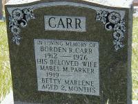 Borden Robert Carr was born on 12 December 1912 at Cramahe Twp., Northumberland Co., Ontario; per family tree of PhyllisSymons on ancestry.ca, Aug 7 2023.1 He married Mabel Mary Parker, daughter of Robert Percival "Percy" Parker and Jennie Gardner, circa 1946 at Ontario; per family tree of PhyllisSymons on ancestry.ca, Aug 7 2023.1 Borden Robert Carr died on 7 March 1976 at Ontario at age 63; Date 1976 per Memorial. Date Mar 7 1976 per family tree of PhyllisSymons on ancestry.ca, Aug 7 2023.1,2 He was buried on 9 March 1976 at Cramahe Hill Cemetery, Cramahe Twp., Northumberland Co., Ontario; Memorial: (see Exhibit) CARR; In Loving Memory of; Borden R. Carr; 1912 - 1976; His Beloved Wife; Mabel M. Parker; 1919 - ; Betty Marlene; Age 2 months (Cramahe Hill Cemetery, Cramahe Twp., image by Dan Buchanan.)2