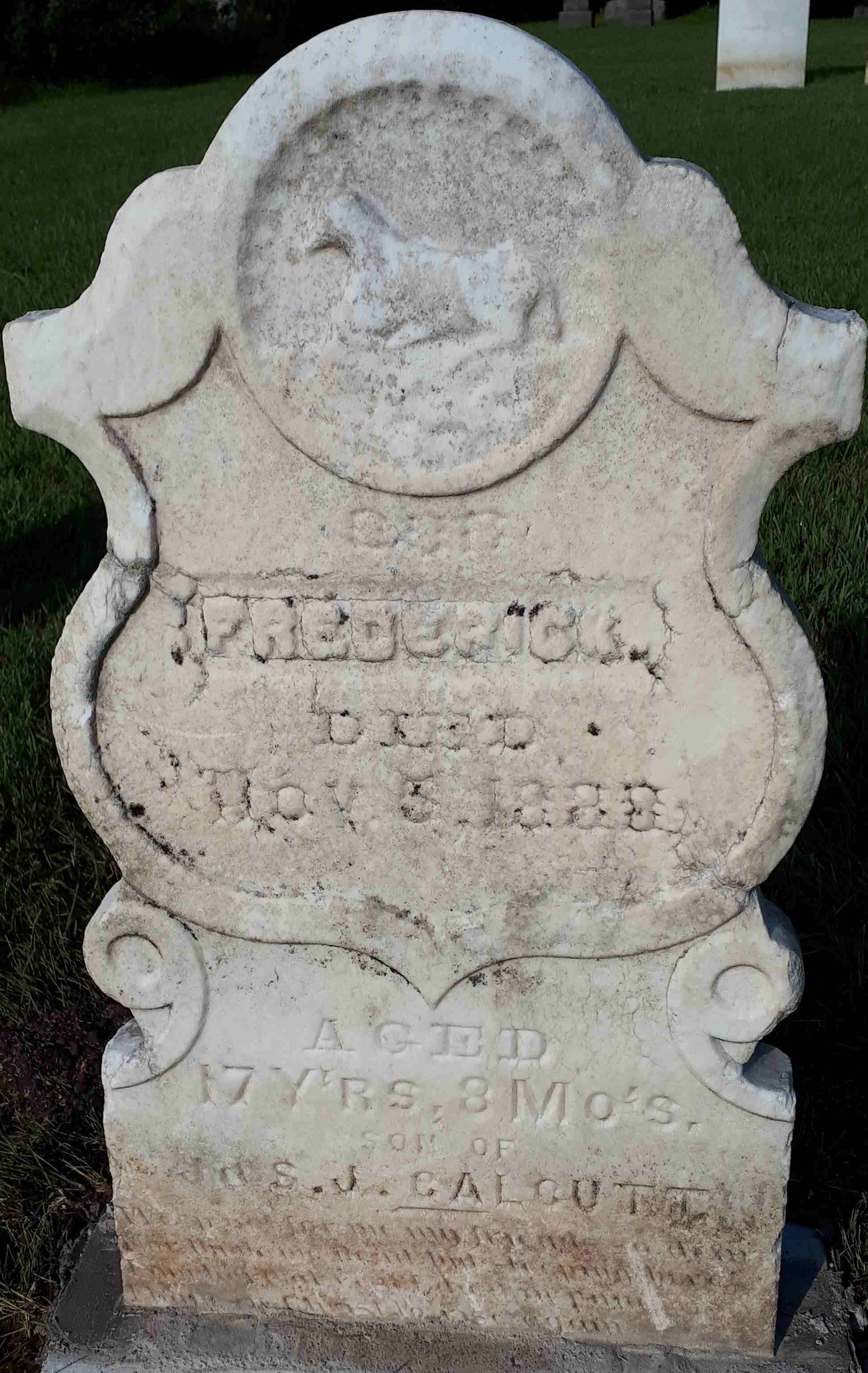 CemSearch: Name: Frederick Calcutt; Born: - ; Died: Nov 5 1888; Age: 17y 8m; ID: CARMAN142; No other names; Cemetery: Carman Cemetery, Conc 2, Lot 27, Brighton Twp., Northumberland Co; Note: Son of J and S. Calcutt. (https://www.cemsearch.ca/burial/?pid=CARMAN142%5E0.)1,2