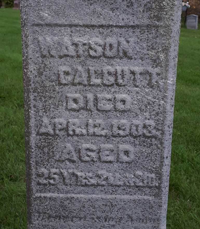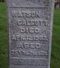 Watson Calcutt was born on 22 January 1878 at Murray Twp., Northumberland Co., Ontario; Date Jan 22 1878 per CemSearch. Date 1877 & location Ont. per 1881 Census.1,2 He appeared on the census of April 1881 at Murray Twp., Northumberland East Co., Ontario; Age 4 at 1881 Census: see Henry Smith (step-father.)2 He appeared on the census of 15 April 1891 at Murray Twp., Northumberland East Co., Ontario; Age 13 at 1891 Census: see Charles Sills (step-father.)3 He died on 12 April 1903 at Murray Twp., Northumberland Co., Ontario, at age 25; Date Apr 12 1903 per CemSearch.1 He was buried on 14 April 1903 at Carman Cemetery, Brighton Twp., Carman, Northumberland Co., Ontario; CemSearch: Name: Watson Calcutt; Born: - ; Died: Apr 12 1903; Age: 25y 2m 21d; ID: CARMAN141; Other name: Calcutt, Sarah J. [Sills] (1840- ); Cemetery: Carman Cemetery, Conc 3, Lot 27, Brighton Twp., Northumberland Co; Note: Husband of Sarah J. Sills; Father of John. Stone repaired 2006. (https://www.cemsearch.ca/burial/?pid=CARMAN141%5E0)