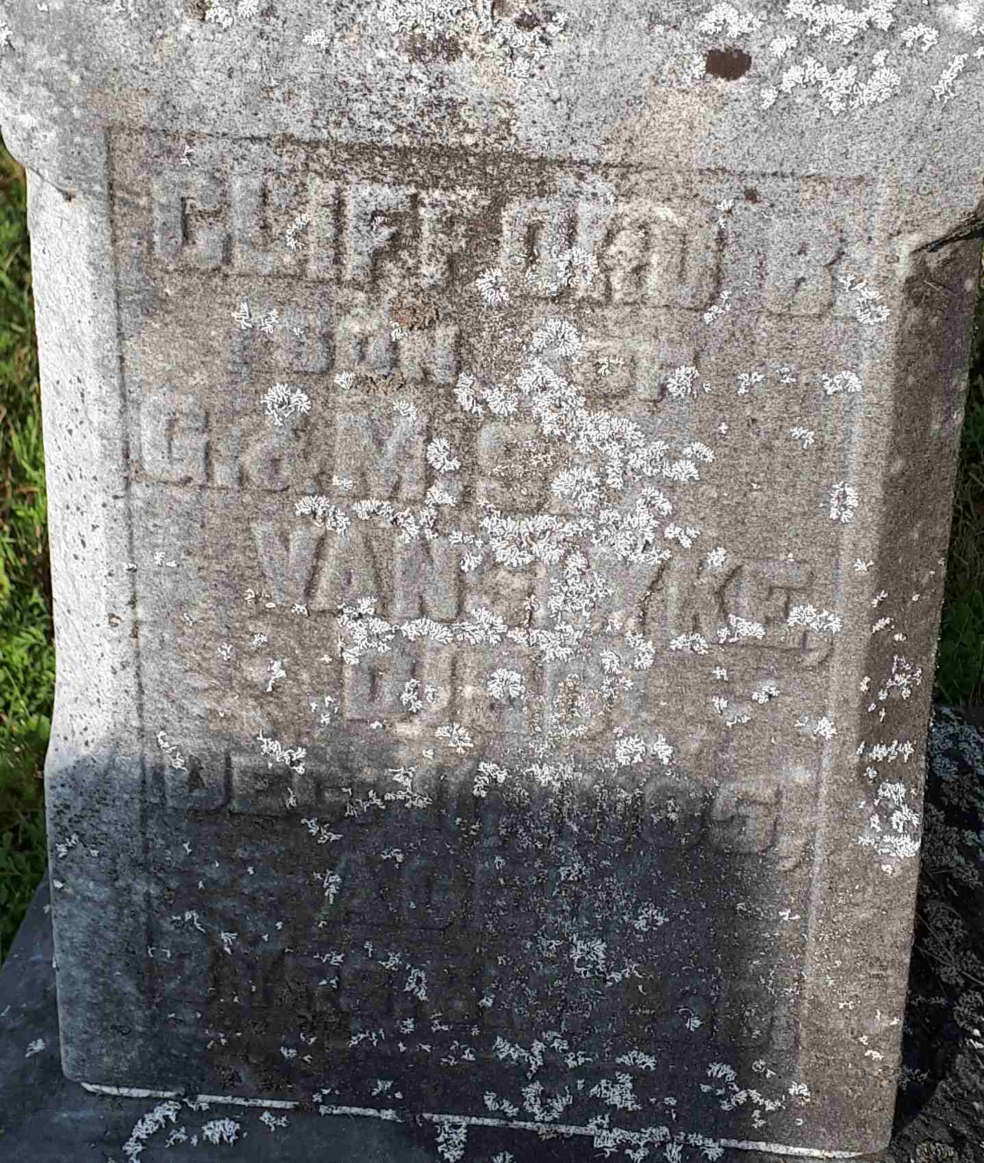 CemSearch: Name: Clifford B. VanSlyke; Born: - ; Died: Dec 11 1905; Age: 3y 6m 5d; ID: CARMAN22; Other names: VanSlyke, Clifford Gilbert (1925-1926); Cemetery: Carman Cemetery, Conc 3, Lot 27, Brighton Twp., Northumberland Co; Note: Son of Gilbert VanSlyke (https://www.cemsearch.ca/burial/?pID=CARMAN22%5E0.)1,2