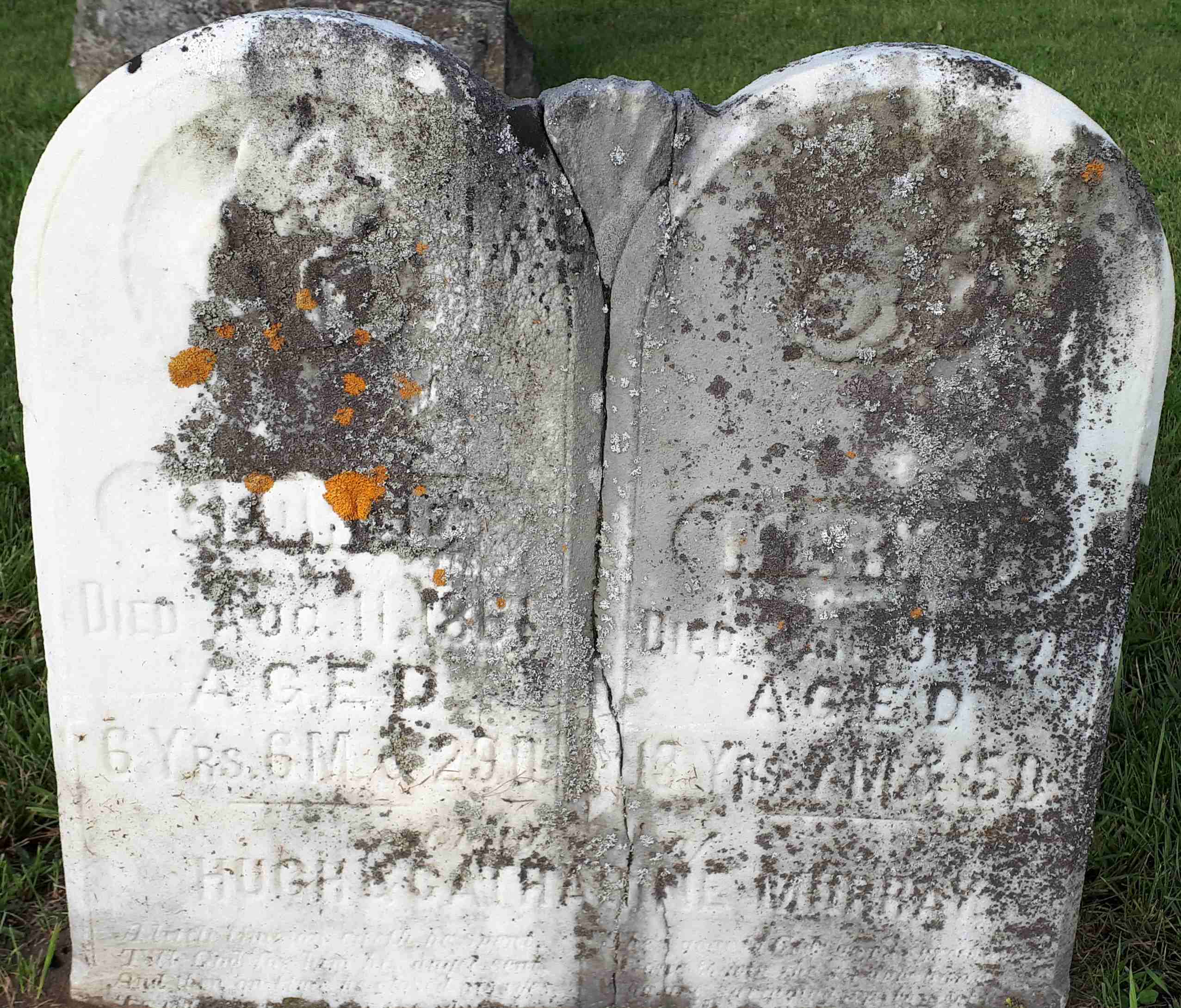 CemSearch: Name: George Murray; Born: - ; Died: Aug 11 1861; Age: 6y 6m 20d; ID: CARMAN63; Other names: Murray, Mary Jane ( -1871); Cemetery: Carman Cemetery, Conc 3, Lot 27, Brighton Twp., Northumberland Co., Sec OLD; Note: Son of Hugh and Catherine Murray. Stone pinned by Bruce Stewart and reset in 2009 Stone also shared with sister Mary. (https://www.cemsearch.ca/burial/?pid=CARMAN63%5E0.)1,2