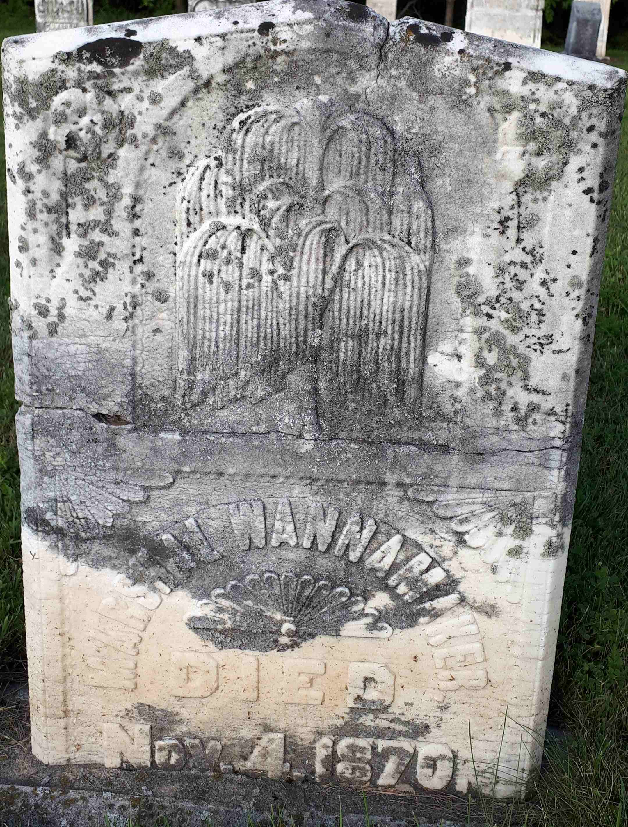 CemSearch: Name: Marshall Wannamaker; Born: - ; Died: Nov 4 1870; ID: CARMAN59; No other names; Cemetery: Carman Cemetery, Conc 3, Lot 27, Brighton Twp., Northumberland Co. (https://www.cemsearch.ca/burial/?pid=CARMAN59%5E0.)1,2