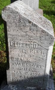 CemSearch: Name: Clifford Gilbert VanSlyke; Born: 1925; Died: Jan 5 1926; Age: 10y 2m 7d; ID: CARMAN22; Other names: VanSlyke, Clifford B. ( -1905); Cemetery: Carman Cemetery, Conc 3, Lot 27, Brighton Twp., Northumberland Co; Note: Son of Gilbert VanSlyke (https://www.cemsearch.ca/burial/?pID=CARMAN22%5E1.)1,2