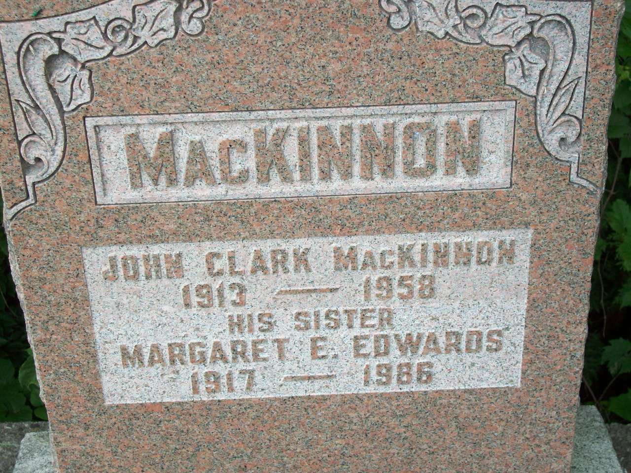 FindaGrave: Name: Margaret C. Edwards MacKinnon; Birth: 1917; Death: 1986 (aged 68–69); Burial: Woods Cemetery, Cramahe Twp., Northumberland Co., Ontario, Canada; Plot: Row 14; Memorial ID: 100968353 (https://www.findagrave.com/memorial/100968353/margaret-c.-mackinnon?_gl=1*f723qu*_gcl_au*NjczODQyODM4LjE3NTI0MDg1OTA.*_ga*MTEzMDM4OTA2OS4xNzUyNDA4NTkx*_ga_QPQNV9XG1B*czJlZGI0ZTI3LTQ1OTQtNDc5YS1iMzZkLTk4ODQ5MTE0ODEyOSRvMSRnMSR0MTc1MjQwOTU0NSRqMjkkbDAkaDA.*_ga_4QT8FMEX30*czJlZGI0ZTI3LTQ1OTQtNDc5YS1iMzZkLTk4ODQ5MTE0ODEyOSRvMSRnMSR0MTc1MjQwOTU0NSRqMjkkbDAkaDA.)3,4