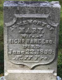 CemSearch: Name: Mary Hare; Born: - ; Died: Jun 22 1859; Age: 77y; ID: GRMTH010; No other names; Cemetery: Old Methodist Cemetery, Old Aird St., Grafton, Haldimand Twp., Northumberland Co; Note: Wife of Richard. (https://www.cemsearch.ca/burial/?pid=GRFMTH010%5E0.)3,4