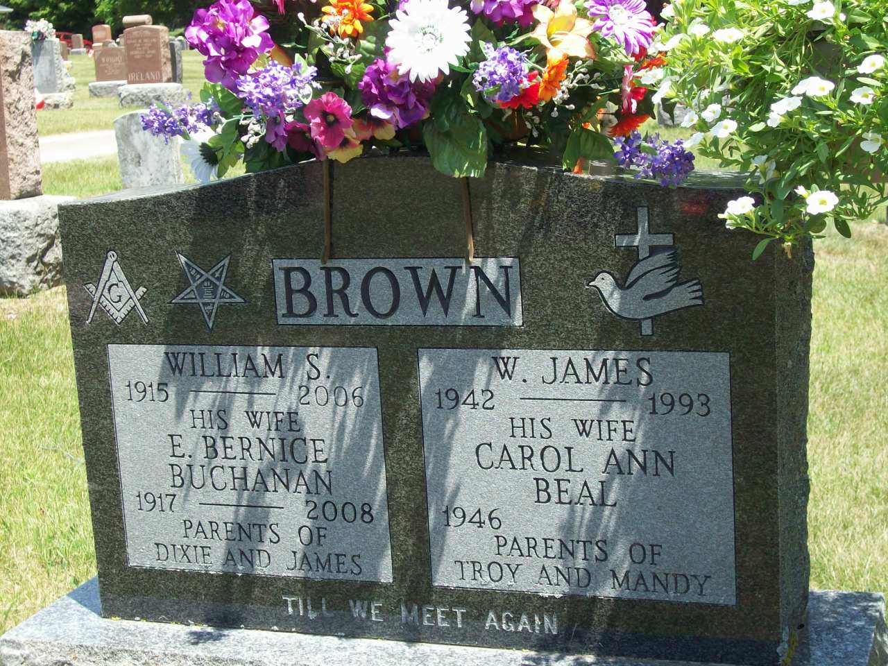 Note from Dan Buchanan: I received a call Tuesday afternoon from Dixie telling me that Aunt Bernice had passed away on Monday. She also asked me to be a pall bearer which I accepted gladly. I took Thursday off and went to Trenton in the afternoon, attending at the Walas Funeral Home in Brighton at 6:00 pm with the family and then for the Eastern Star Service. Visitation commenced at 7 pm and was busy until around 8:30 when we had time to visit. The funeral service on Friday was touching and comforting. Dad provided his normal inspiring and thoughtful message and our work as pall bearers was short, cold and satisfying. Good family visiting followed in the Church Hall and I was able to speak to several persons of interest. Later I went to Dad's in Belleville where we had supper, worked a bit with this new digital camera and digital picture frame and had a good visit. All in all, not a bad few days under the circumstances. Aunt Bernice would have been happy to see the family get together for whatever reason. (Dan Buchanan, Feb 17, 2008.)7 She was buried on 14 February 2008 at Salem Cemetery, Cramahe Twp., Salem, Northumberland Co., Ontario; Memorial: (See Exhibit) BROWN; William S; 1915 - 2006; His Wife; E. Bernice; Buchanan; 1917 - ; Parents of Dixie and James; W. James; 1942 - 1993; His Wife; Carol Ann; Beal; 1946 - ; Parents of; Troy and Mandy (Salem Cemetery, Salem, June 21, 2009.)3
