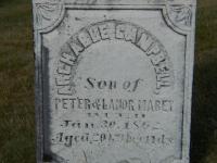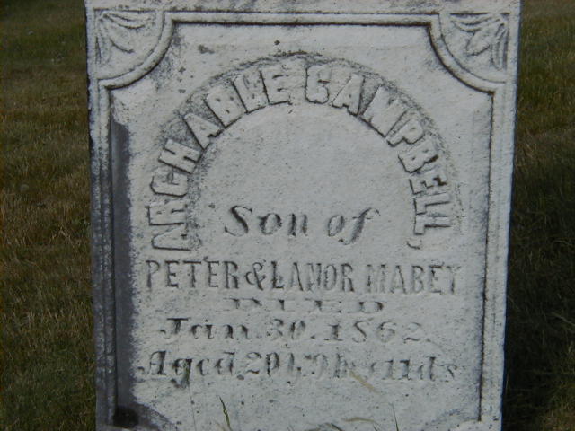 Archable Campbell Maybee was born on 19 April 1841 at Sidney Twp., Hastings Co., Ontario; Date Apr 19 1841 per Burial. Date Mar 19 1841 per Doug Maybee email, June 27, 2001.1 He appeared on the census of 1851 at Brighton Twp., Northumberland Co., Ontario; Age 11 at 1851 Census: see Peter Maybee.2 He appeared on the census of 1861 at Brighton Twp., Northumberland Co., Ontario; Age 19 at 1861 Census: see Peter Maybee.3 He died on 30 January 1862 at Brighton Twp., Northumberland Co., Ontario, at age 20; Date Jan 30 1862 per Burial. Per Doug Maybee email, June 27, 2001.1 He was buried on 2 February 1862 at McPhail's Cemetery, Brighton Twp., Northumberland Co., Ontario; Memorial: (See Exhibit) Archable Campbell Mabey; Son of; Peter & Lanor Mabey; Died; Jan 30, 1862; Aged 20 Y's. 9 m's. 11 ds (McPhail's Cemetery, Brighton Twp., June 4, 2005.)1